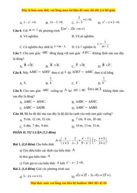 Khẳng định nào sau đây là đúng? A. B. C. D. Câu 8. Nếu theo tỉ số thì theo tỉ số bằng A. B. C. D. Câu 9. Cho tam giác vuông tại kẻ Khẳng định nào sau đây là đúng? A. B. C. D.