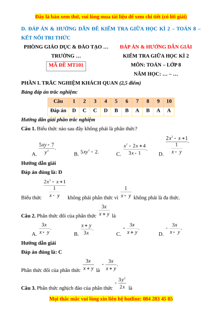 D. ĐÁP ÁN & HƯỚNG DẪN ĐỀ KIỂM TRA GIỮA HỌC KÌ 2 – TOÁN 8 – KẾT NỐI TRI THỨC