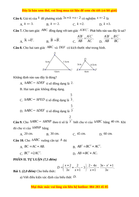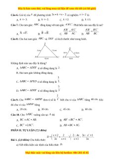 tỉ số đồng dạng là . D. tỉ số đồng dạng là Câu 9. Cho theo tỉ số là biết chu vi của bằng Khi đó chu vi của bằng A. B. C. D. Câu 10. Cho vuông cân tại thì A. B. C. D.