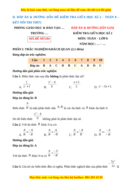 D. ĐÁP ÁN & HƯỚNG DẪN ĐỀ KIỂM TRA GIỮA HỌC KÌ 2 – TOÁN 8 – KẾT NỐI TRI THỨC