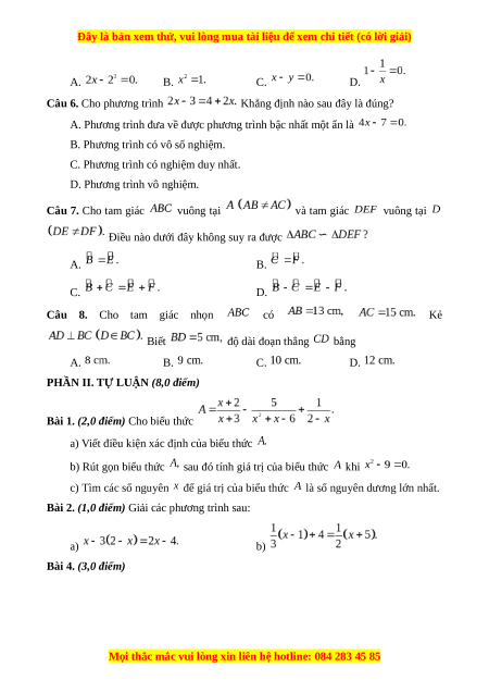 D. Phương trình vô nghiệm. Câu 7. Cho tam giác vuông tại và tam giác vuông tại