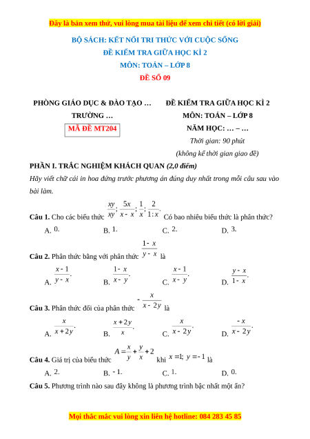 ĐỀ KIỂM TRA GIỮA HỌC KÌ 2 TRƯỜNG … MÔN: TOÁN – LỚP 8 MÃ ĐỀ MT204 NĂM HỌC: … – … Thời gian: 90 phút