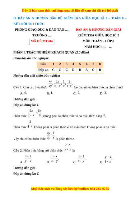D. ĐÁP ÁN & HƯỚNG DẪN ĐỀ KIỂM TRA GIỮA HỌC KÌ 2 – TOÁN 8 – KẾT NỐI TRI THỨC