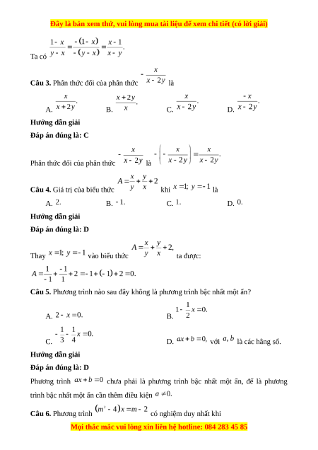 Câu 3. Phân thức đối của phân thức là A. B. C. D.