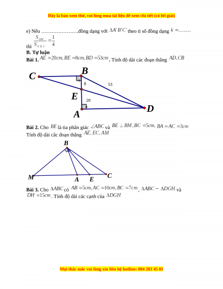 e) Nếu ………………….đồng dạng với theo tỉ số đồng dạng thì B. Tự luận Bài 1.