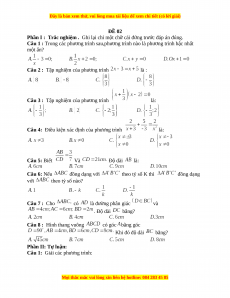 Câu 4: Điều kiện xác định của phương trình là: Câu 5: Biết Và Độ dài là: Câu 6: Nếu đồng dạng với theo tỷ số K thì đồng dạng với theo tỷ số nào? Câu 7 : Cho có là đường phân giác và . Độ dài bằng?
