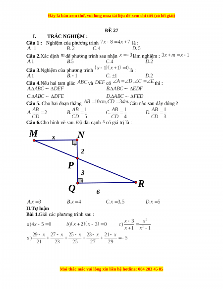 Câu 6.Cho hình vẽ sau. Độ dài cạnh có giá trị là : M x N 2 P 3 R Q 6 II.Tự luận