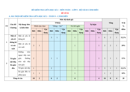 A. MA TRẬN ĐỀ KIỂM TRA GIỮA HỌC KÌ 2 – TOÁN 9 – CÁNH DIỀU Mức độ đánh giá TNKQ Tổng Tỉ lệ