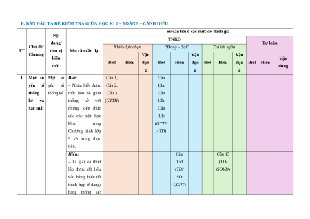 B. BẢN ĐẶC TẢ ĐỀ KIỂM TRA GIỮA HỌC KÌ 2 – TOÁN 9 – CÁNH DIỀU