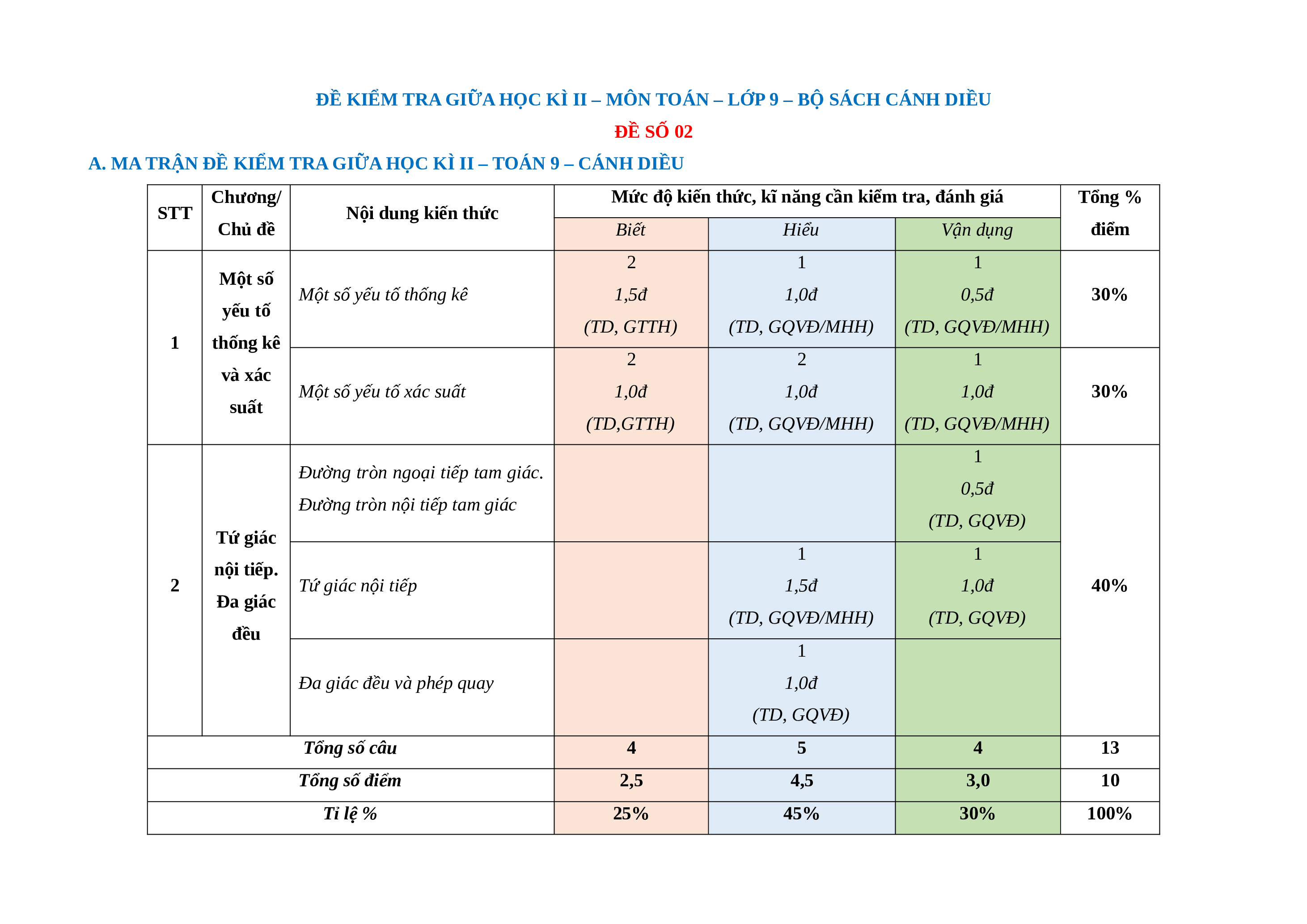 A. MA TRẬN ĐỀ KIỂM TRA GIỮA HỌC KÌ II – TOÁN 9 – CÁNH DIỀU Chương/