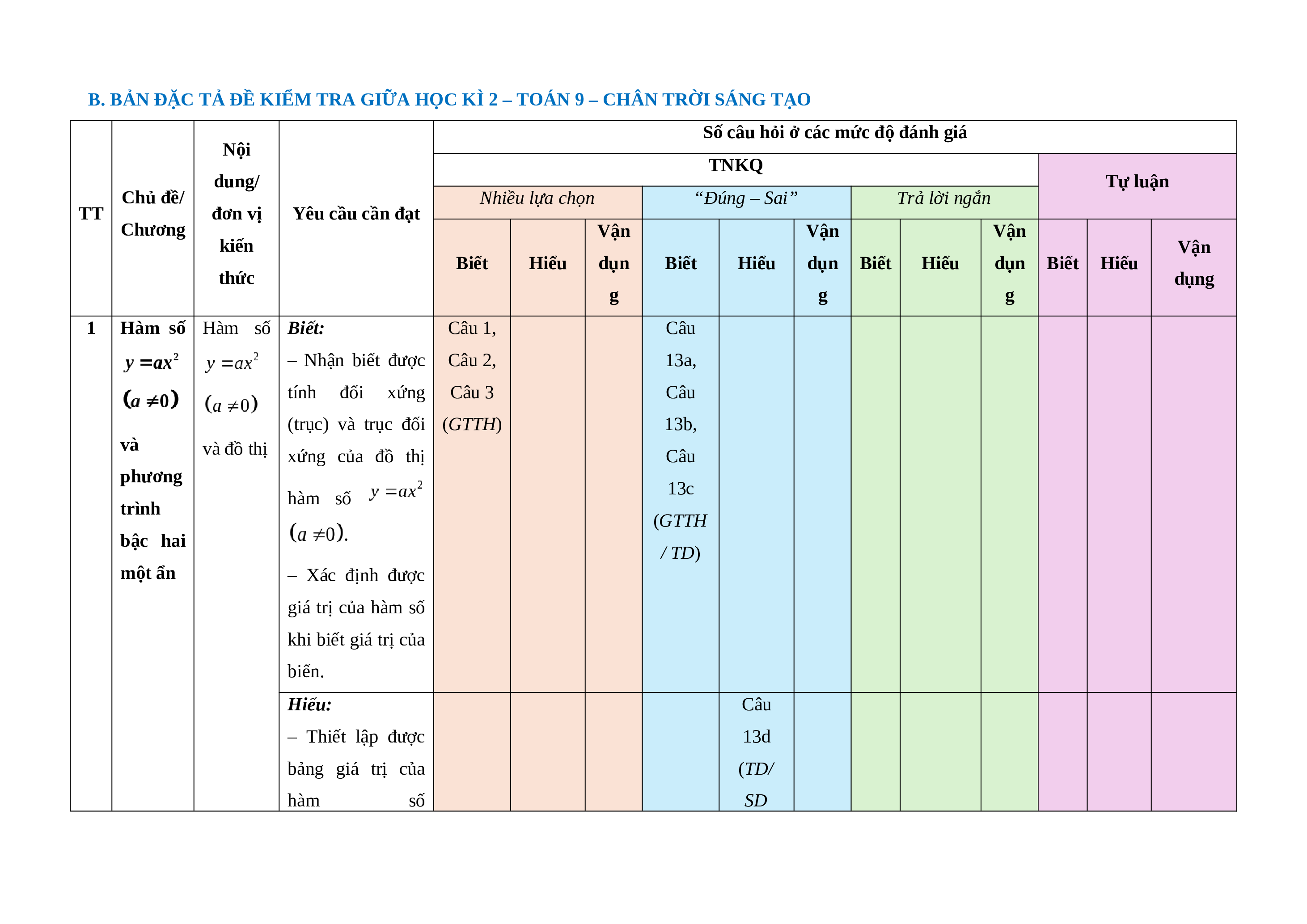 B. BẢN ĐẶC TẢ ĐỀ KIỂM TRA GIỮA HỌC KÌ 2 – TOÁN 9 – CHÂN TRỜI SÁNG TẠO