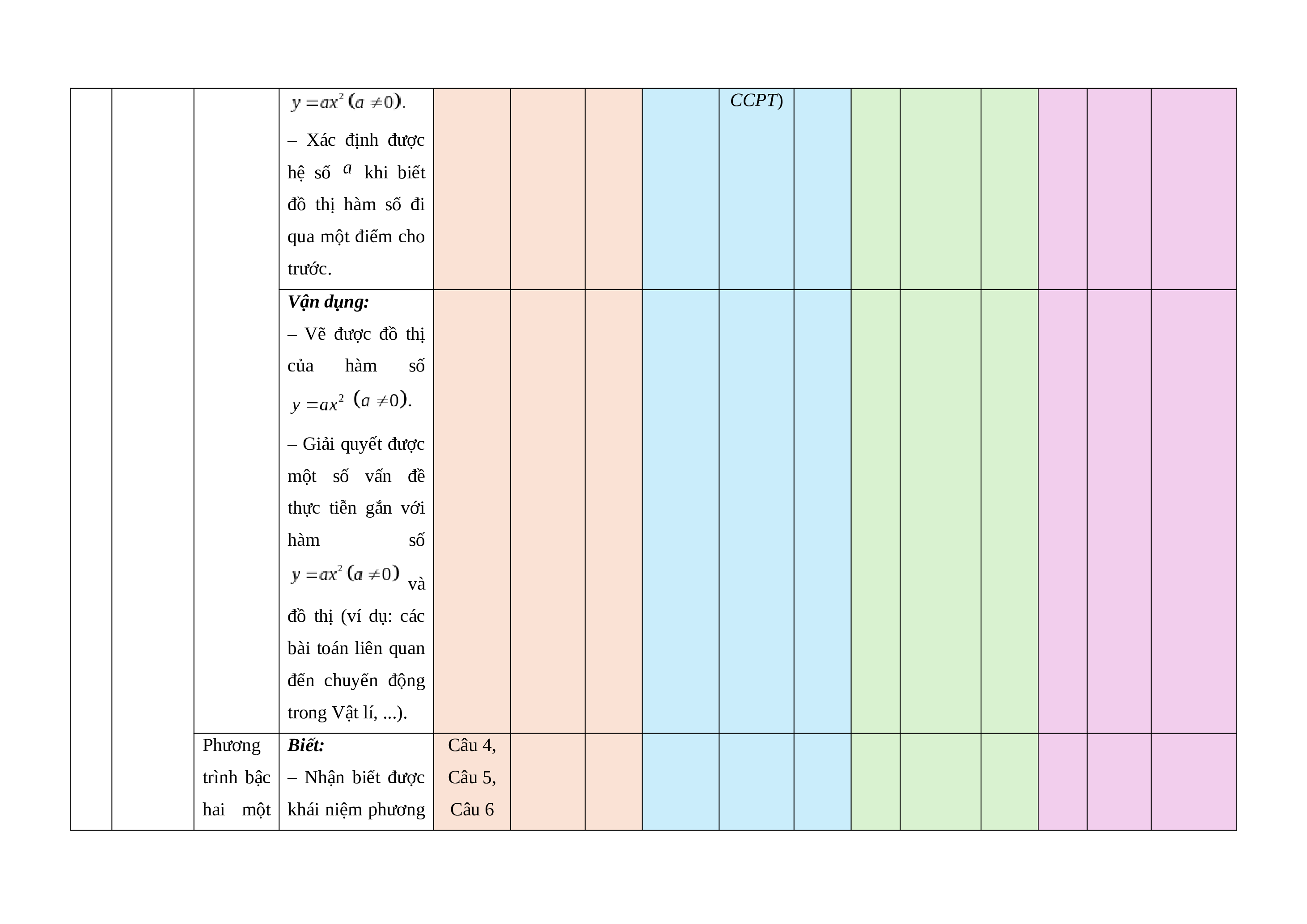 và đồ thị xứng của đồ thị Câu phương hàm số 13c trình (GTTH bậc hai / TD) một ẩn – Xác định được giá trị của hàm số khi biết giá trị của biến. Hiểu: Câu – Thiết lập được 13d bảng giá trị của (TD/ hàm số SD CCPT) – Xác định được hệ số khi biết đồ thị hàm số đi qua một điểm cho trước. Vận dụng: – Vẽ được đồ thị của hàm số – Giải quyết được một số vấn đề thực tiễn gắn với hàm số và đồ thị (ví dụ: các bài toán liên quan đến chuyển động trong Vật lí, ...). Phương Biết: Câu 4,