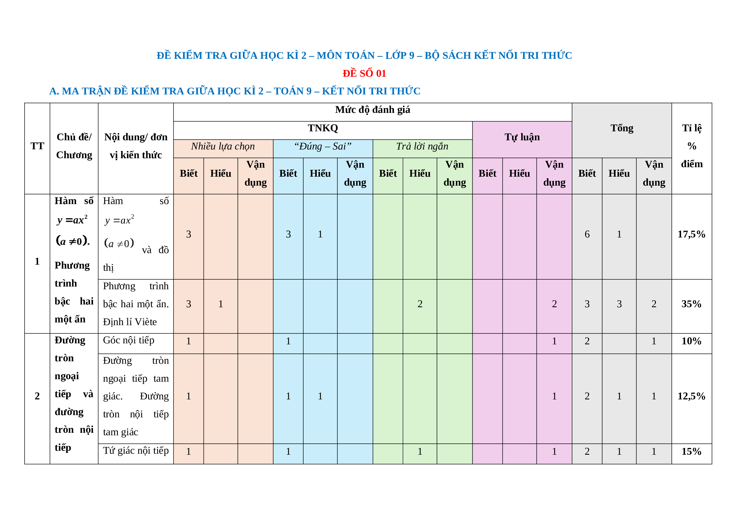 A. MA TRẬN ĐỀ KIỂM TRA GIỮA HỌC KÌ 2 – TOÁN 9 – KẾT NỐI TRI THỨC Mức độ đánh giá TNKQ Tổng Tỉ lệ