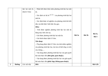 Phương trình bậc hai một ẩn. 2 2 (TD, 50% ẩn Định lí Viète (TD, PTTH) (TD, GQVĐ) GQVĐ/MHH) 1 Góc nội tiếp (TD, GQVĐ)
