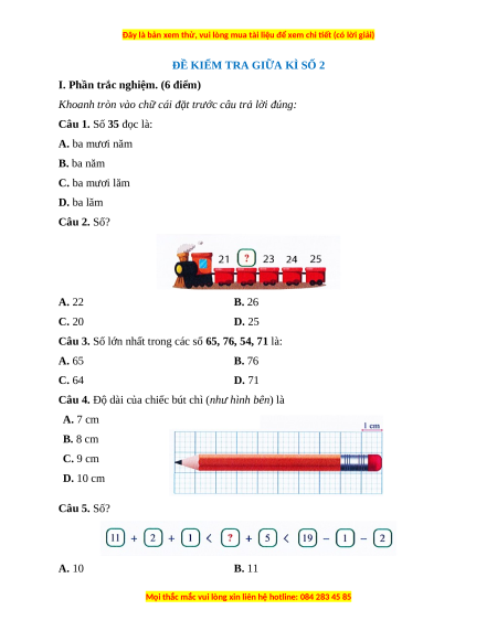 Câu 1. Số 35 đọc là: A. ba mươi năm B. ba năm C. ba mươi lăm D. ba lăm Câu 2. Số? A. 22 B. 26 C. 20 D. 25