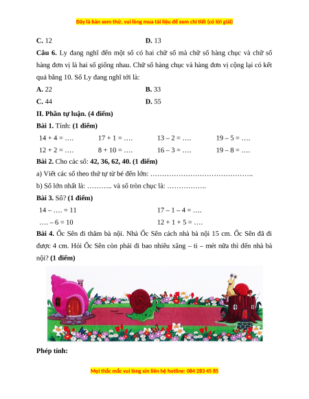 được 4 cm. Hỏi Ốc Sên còn phải đi bao nhiêu xăng – ti – mét nữa thì đến nhà bà nội? (1 điểm) Phép tính: