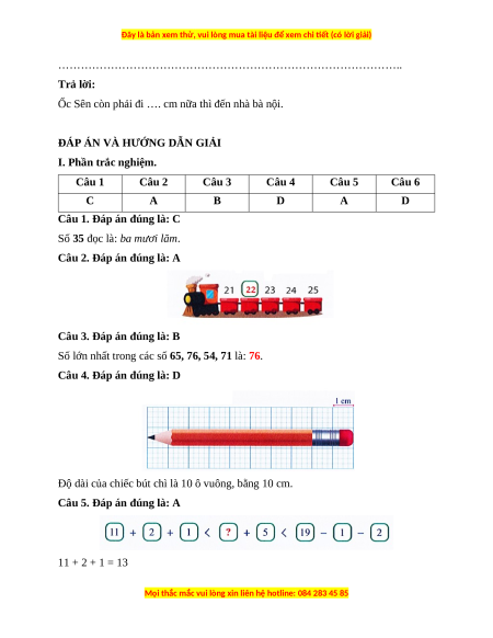 Câu 4. Độ dài của chiếc bút chì (như hình bên) là A. 7 cm B. 8 cm C. 9 cm D. 10 cm Câu 5. Số? A. 10 B. 11