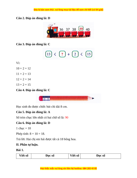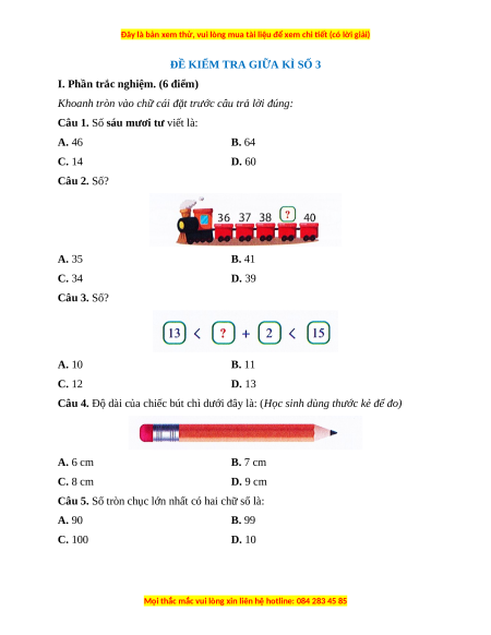 Câu 1. Số sáu mươi tư viết là: A. 46 B. 64 C. 14 D. 60 Câu 2. Số? A. 35 B. 41 C. 34 D. 39 Câu 3. Số? A. 10 B. 11 C. 12 D. 13