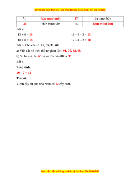 Bài 1. Viết số hoặc cách đọc số thích hợp: (1 điểm) Viết số Đọc số Viết số Đọc số 71 ……………………. ….. ba mươi bảy …… chín mươi tám 55 …………………….