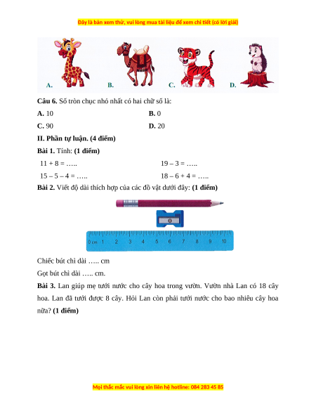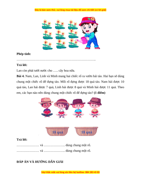 hoa. Lan đã tưới được 8 cây. Hỏi Lan còn phải tưới nước cho bao nhiêu cây hoa nữa? (1 điểm)