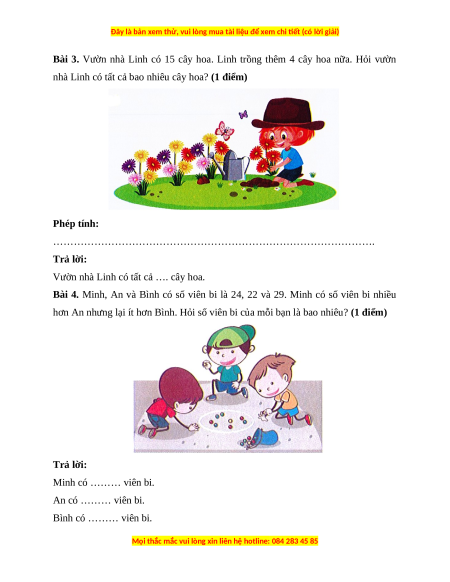 Bài 3. Vườn nhà Linh có 15 cây hoa. Linh trồng thêm 4 cây hoa nữa. Hỏi vườn