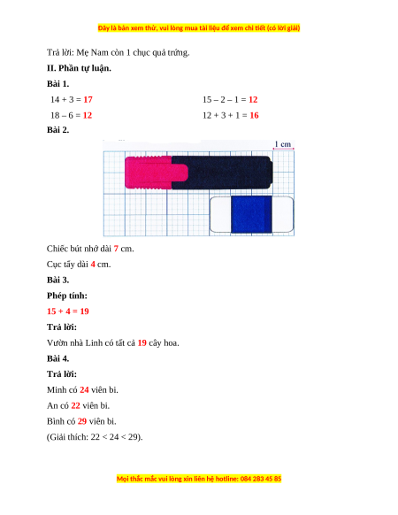 Chiếc bút nhớ dài ….. cm. Cục tẩy dài …. cm.