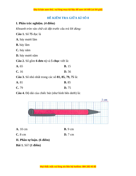 Câu 1. Số 75 đọc là A. bảy mươi lăm B. bảy lăm C. bảy năm D. bảy mươi năm