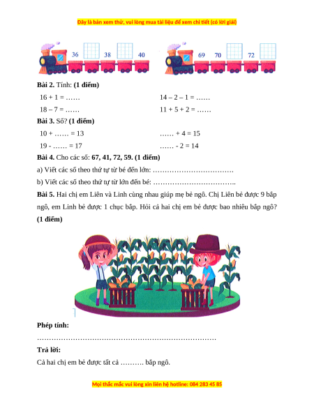 ngô, em Linh bẻ được 1 chục bắp. Hỏi cả hai chị em bẻ được bao nhiêu bắp ngô? (1 điểm) Phép tính: