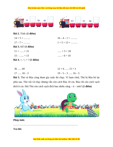 đích 6 cm. Hỏi Thỏ còn cách vạch đích bao nhiêu xăng – ti – mét? (1 điểm) Phép tính: