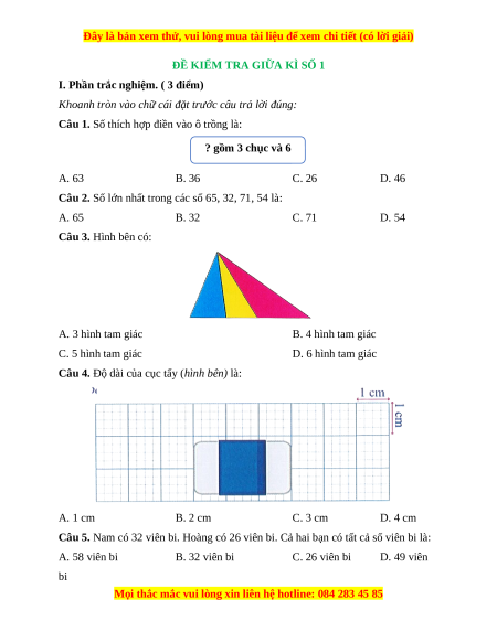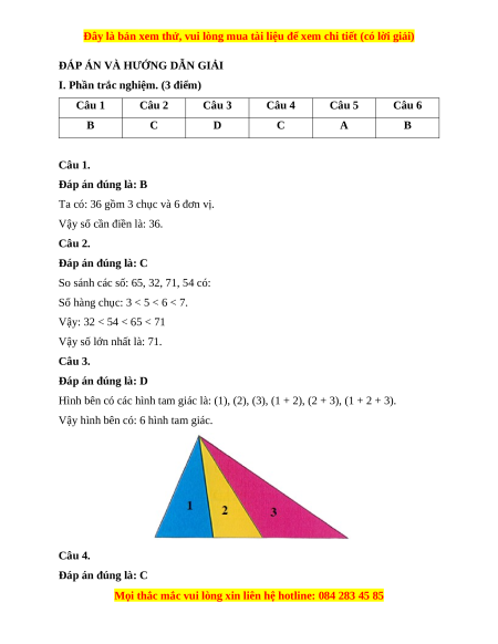 Câu 2. Số lớn nhất trong các số 65, 32, 71, 54 là: A. 65 B. 32 C. 71 D. 54 Câu 3. Hình bên có: A. 3 hình tam giác B. 4 hình tam giác C. 5 hình tam giác D. 6 hình tam giác
