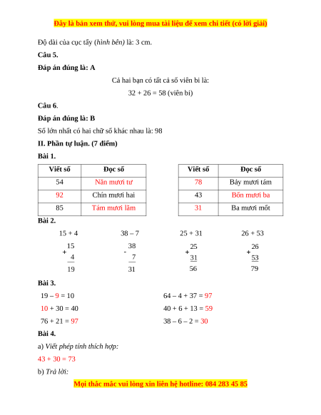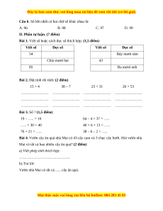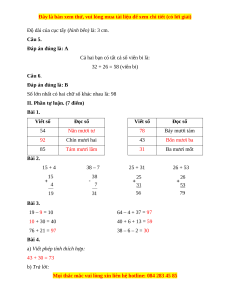 II. Phần tự luận. (7 điểm) Bài 1. Viết số Đọc số Viết số Đọc số 54 Năn mươi tư 78 Bảy mươi tám 92 Chín mươi hai 43 Bốn mươi ba 85 Tám mươi lăm 31 Ba mươi mốt Bài 2. 15 + 4 38 – 7 25 + 31 26 + 53 Bài 3. 19 – 9 = 10 64 – 4 + 37 = 97 10 + 30 = 40 40 + 6 + 13 = 59 76 + 21 = 97 38 – 6 – 2 = 30 Bài 4.