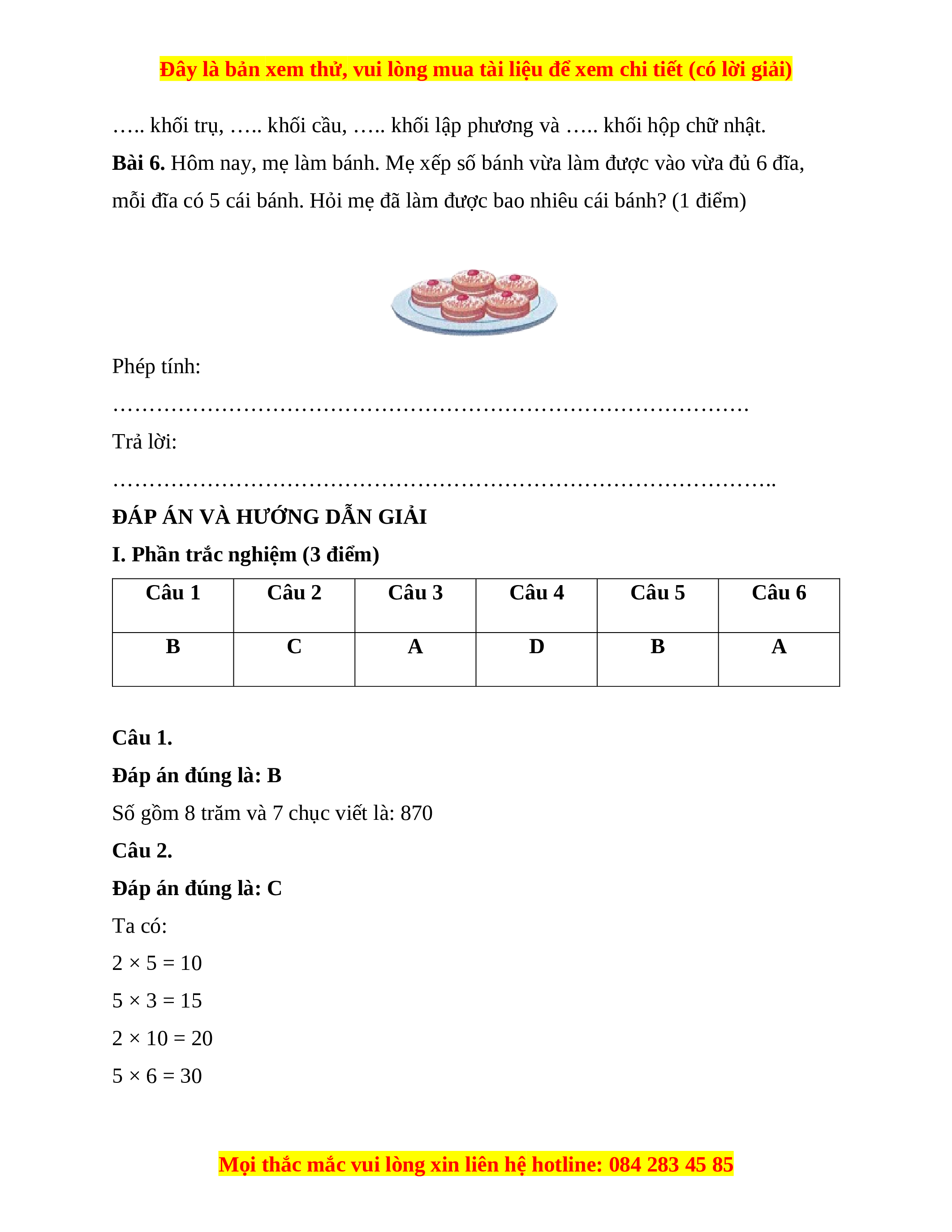 Số gồm 8 trăm và 7 chục viết là: 870 Câu 2. Đáp án đúng là: C Ta có: 2 × 5 = 10 5 × 3 = 15 2 × 10 = 20 5 × 6 = 30