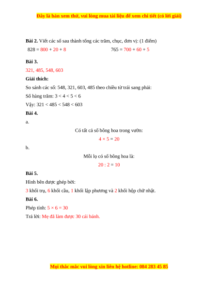 Bài 2. Viết các số sau thành tổng các trăm, chục, đơn vị: (1 điểm) 828 = ….. + ….. + ….. 765 = ….. + ….. + …..
