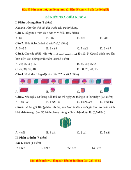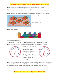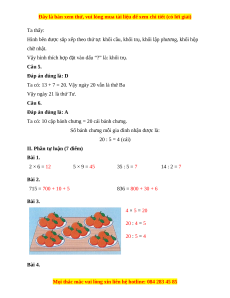 II. Phần tự luận (7 điểm) Bài 1. 2 × 6 = 12 5 × 9 = 45 35 : 5 = 7 14 : 2 = 7 Bài 2. 715 = 700 + 10 + 5 836 = 800 + 30 + 6 Bài 3. 4 × 5 = 20 20 : 4 = 5 20 : 5 = 4 Bài 4.
