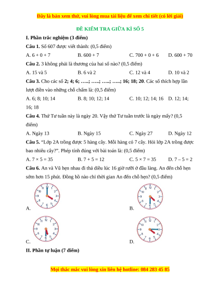 Câu 2. 3 không phải là thương của hai số nào? (0,5 điểm) A. 15 và 5 B. 6 và 2 C. 12 và 4 D. 10 và 2