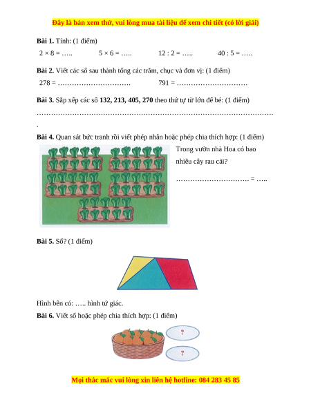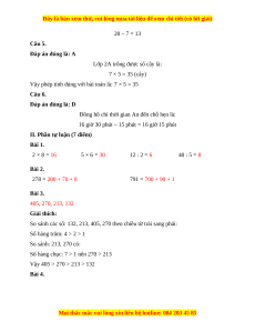 II. Phần tự luận (7 điểm) Bài 1. 2 × 8 = 16 5 × 6 = 30 12 : 2 = 6 40 : 5 = 8 Bài 2. 278 = 200 + 70 + 8 791 = 700 + 90 + 1 Bài 3. 405, 270, 213, 132 Giải thích: