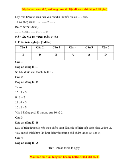 Số 607 được viết thành: 600 + 7 Câu 2. Đáp án đúng là: D Ta có: 15 : 5 = 3 6 : 2 = 3 12 : 4 = 3 10 : 2 = 5