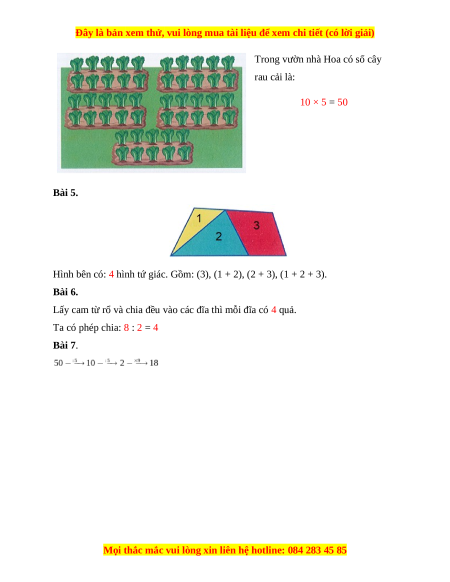 Câu 5. “Lớp 2A trồng được 5 hàng cây. Mỗi hàng có 7 cây. Hỏi lớp 2A trồng được