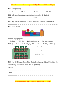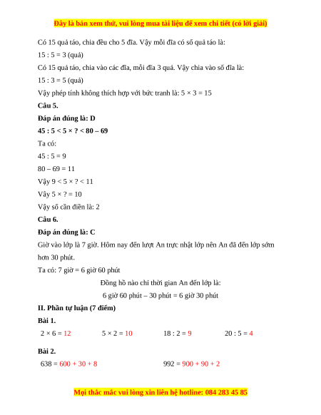II. Phần tự luận (7 điểm) Bài 1. 2 × 6 = 12 5 × 2 = 10 18 : 2 = 9 20 : 5 = 4 Bài 2. 638 = 600 + 30 + 8 992 = 900 + 90 + 2