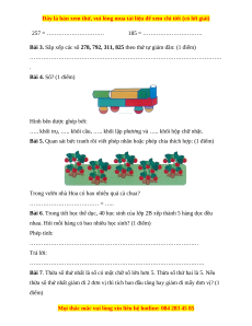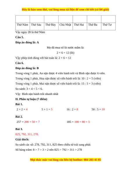 II. Phần tự luận (7 điểm) Bài 1. 2 × 2 = 4 5 × 1 = 5 16 : 2 = 8 50 : 5 = 10 Bài 2. 257 = 200 + 50 + 7 185 = 100 + 80 + 5 Bài 3. 825, 792, 311, 278. Giải thích: