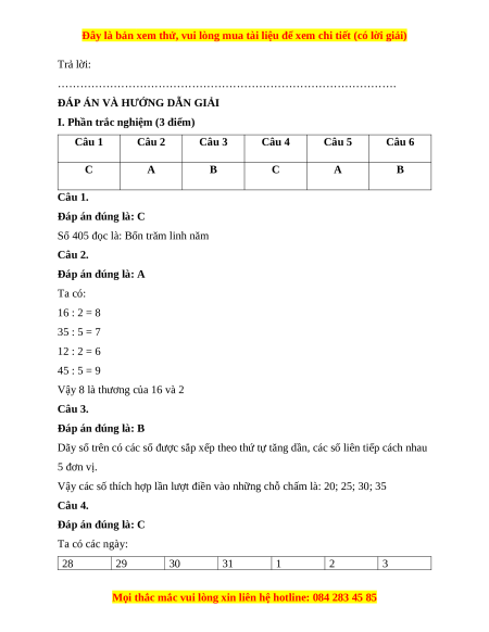 Số 405 đọc là: Bốn trăm linh năm Câu 2. Đáp án đúng là: A Ta có: 16 : 2 = 8 35 : 5 = 7 12 : 2 = 6 45 : 5 = 9