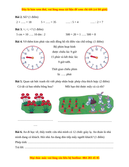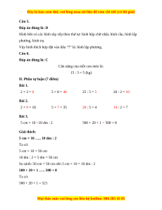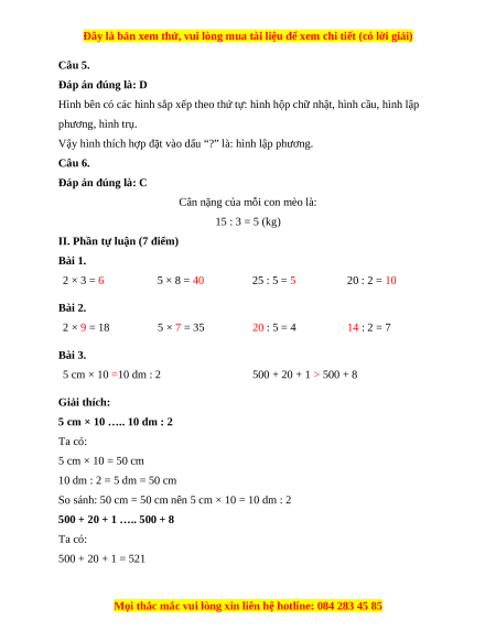 II. Phần tự luận (7 điểm) Bài 1. 2 × 3 = 6 5 × 8 = 40 25 : 5 = 5 20 : 2 = 10 Bài 2. 2 × 9 = 18 5 × 7 = 35 20 : 5 = 4 14 : 2 = 7 Bài 3. 5 cm × 10 =10 dm : 2 500 + 20 + 1 > 500 + 8 Giải thích: