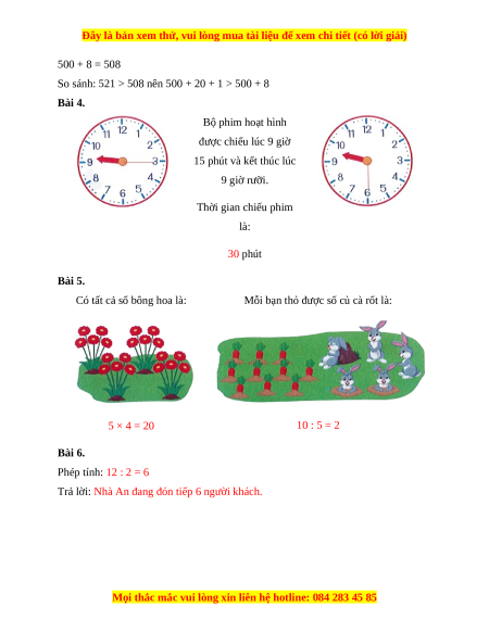 Bài 4. Vẽ thêm kim phút vào mỗi đồng hồ rồi điền vào chỗ trống: (1 điểm) Bộ phim hoạt hình được chiếu lúc 9 giờ 15 phút và kết thúc lúc 9 giờ rưỡi. Thời gian chiếu phim là: ….. phút