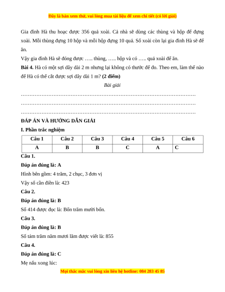 Số tám trăm năm mươi lăm được viết là: 855 Câu 4. Đáp án đúng là: C Mẹ nấu xong lúc: