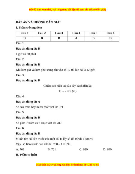 I. Phần trắc nghiệm Câu 1 Câu 2 Câu 3 Câu 4 Câu 5 Câu 6 D B D A B D Câu 1. Đáp án đúng là: D 1 giờ có 60 phút Câu 2. Đáp án đúng là: B