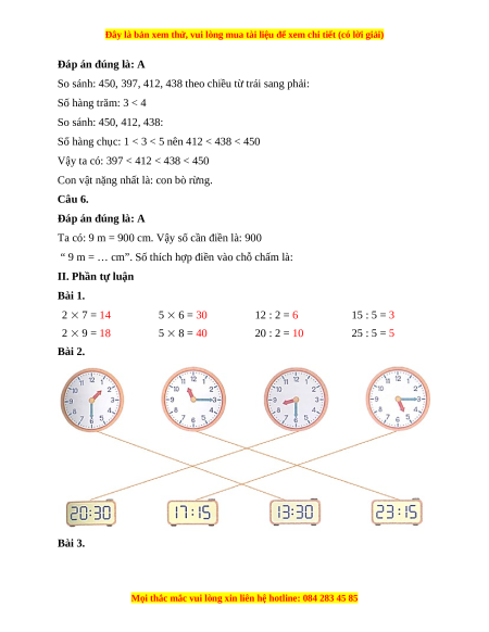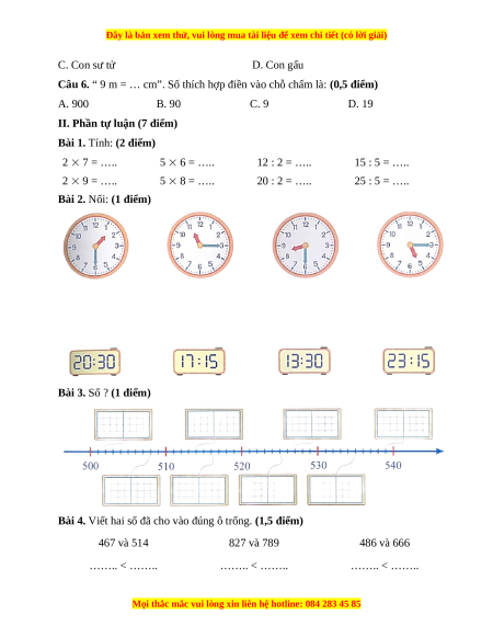 “ 9 m = … cm”. Số thích hợp điền vào chỗ chấm là: II. Phần tự luận Bài 1. 2 7 = 14 5 6 = 30 12 : 2 = 6 15 : 5 = 3 2 9 = 18 5 8 = 40 20 : 2 = 10 25 : 5 = 5 Bài 2. Bài 3.