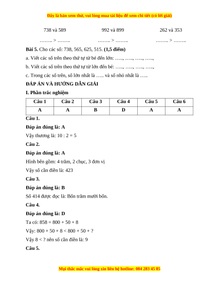 I. Phần trắc nghiệm Câu 1 Câu 2 Câu 3 Câu 4 Câu 5 Câu 6 A A B D A A Câu 1. Đáp án đúng là: A Vậy thương là: 10 : 2 = 5 Câu 2. Đáp án đúng là: A