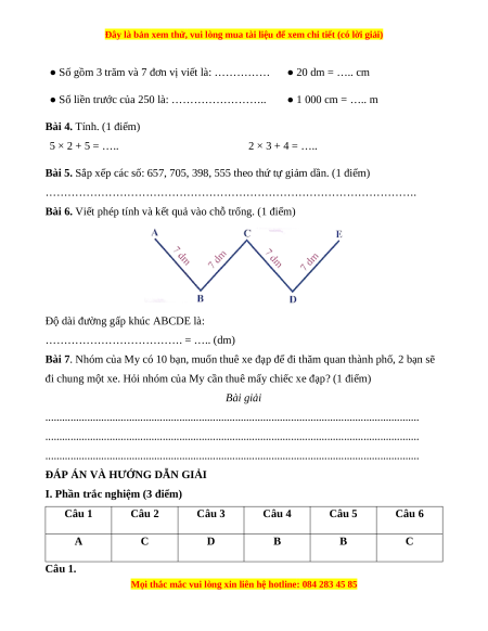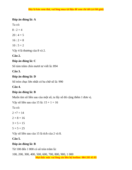 Vậy có tất cả 10 số tròn trăm. Câu 6. Đáp án đúng là: C