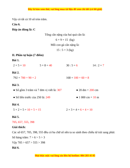 II. Phần tự luận (7 điểm) Bài 1. 2 × 5 = 10 5 × 8 = 40 30 : 5 = 6 14 : 2 = 7 Bài 2. 792 = 700 + 90 + 2 168 = 100 + 60 + 8 Bài 3.
