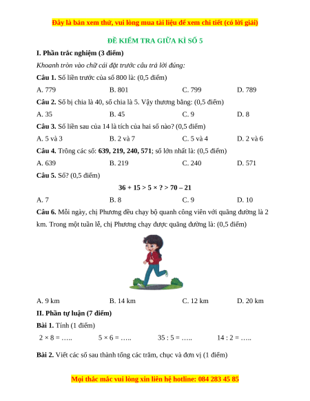 Câu 1. Số liền trước của số 800 là: (0,5 điểm) A. 779 B. 801 C. 799 D. 789